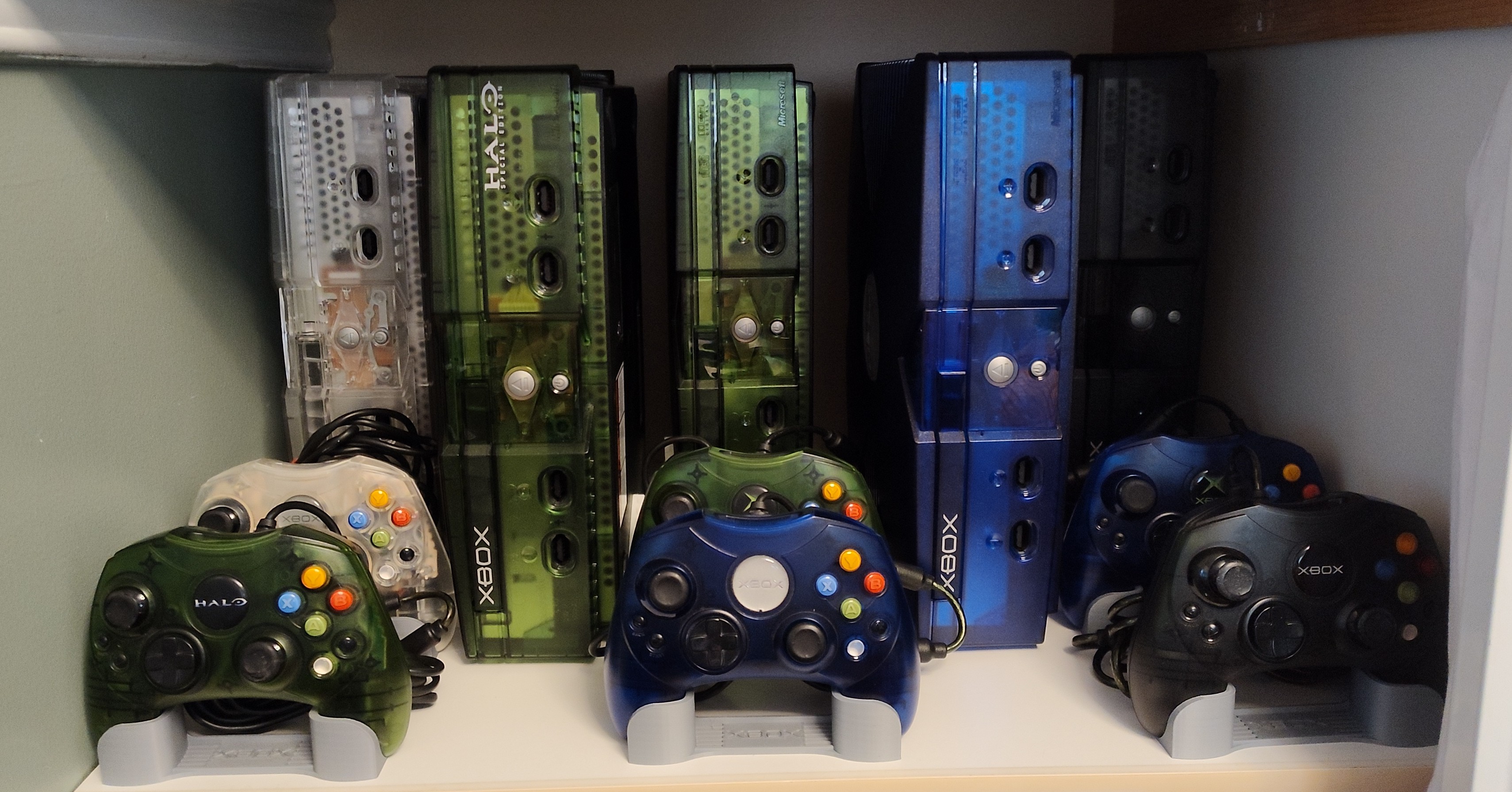 | Xbox Collection The highlights of my Xbox collection consists of all officially released North American transparent model Xboxs while also containing matching controllers. The Japanese Skeleton Black was also included as an easy to obtain transparent limited edition. |